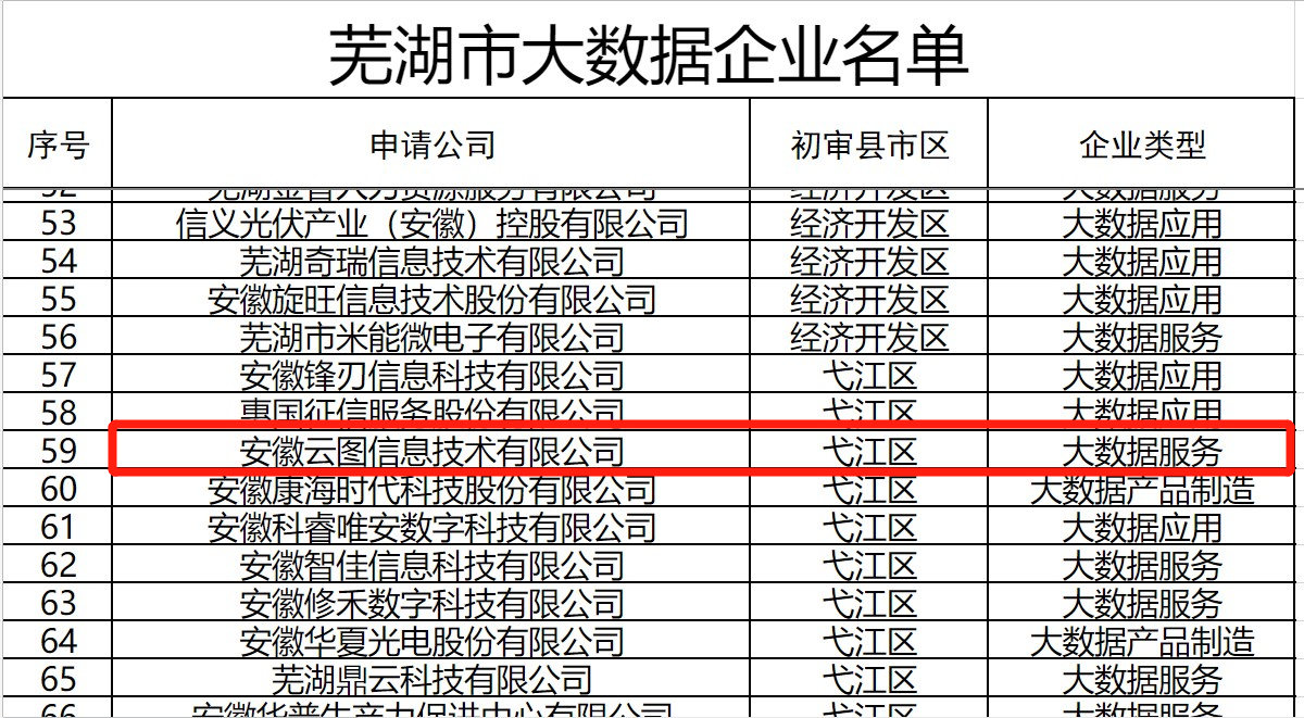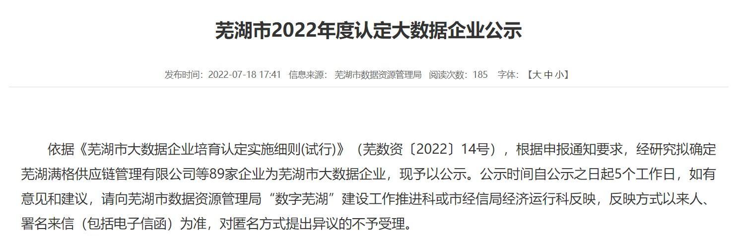 7月18日,芜湖市经信局公布了 2022年度芜湖市大数据企业认定名单,经过5天的公示期,安徽多多28信息技术有限公司等89家企业认定为2022年度芜湖市大数据企业。