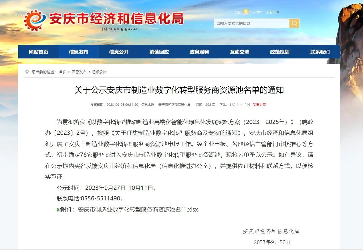 9月26日,安庆市经济和信息化局发布了《关于公示安庆市制造业数字化转型服务商资源池名单的通知》,安徽多多28继入选安徽省制造业数字化转型服务商、芜湖市数字化转型服务商后,再次入选市级数字化转型服务商。