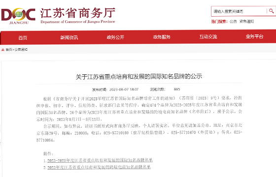据悉,为贯彻落实《中共江苏省委江苏省人民政府关于推进贸易高质量发展的实施意见》等文件要求,全面推进江苏省国际知名品牌建设工作,加快转变外贸发展方式,江苏省商务厅开展了重点培育和发展的国际知名品牌评选工作,这项评选每三年组织一次,重点考察企业研发创新能力、按国际标准组织生产、市场销售、知识产权保护、全球化经营、社会评价等方面。