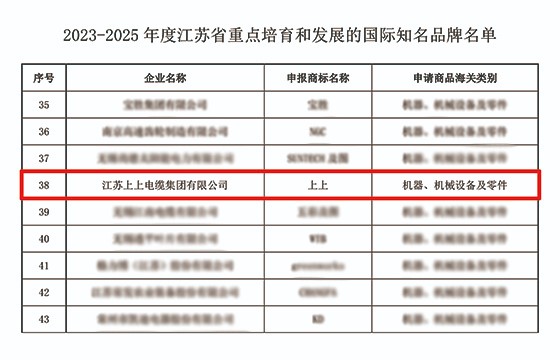 上上电缆入选“2023-2025年度江苏省重点培育和发展的国际知名品牌”