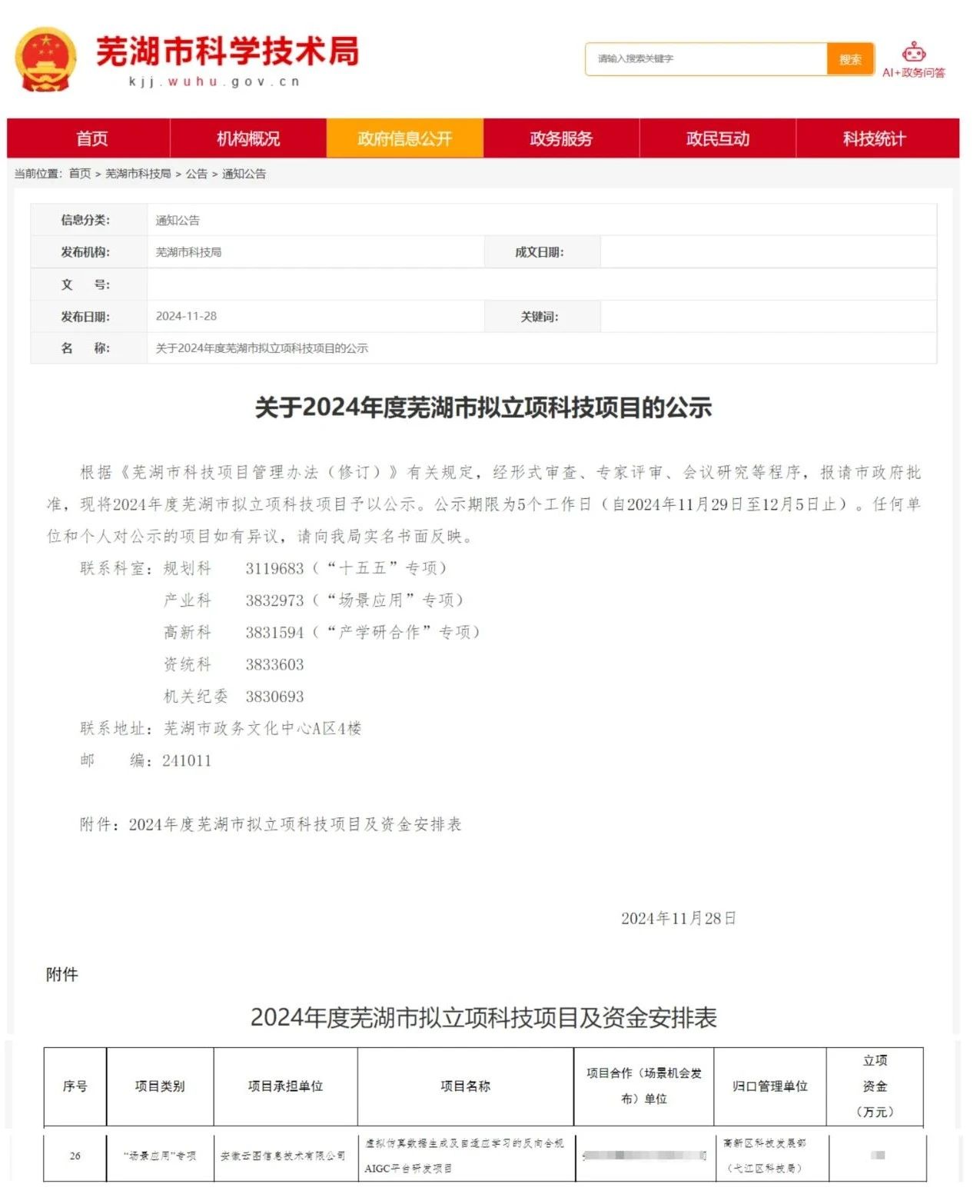 ? ? ? 2024年11月28日,安徽多多28信息技术有限公司凭借在仿真数据合成领域的深厚积累,申报的“虚拟仿真数据生成及自适应学习的反向合规AIGC平台研发项目”近日正式被纳入2024年度芜湖市科技局立项科技项目!此次成就不仅是对我司科研实力的认可,更是芜湖市科技局对促进本地科技创新环境和支持高新技术企业发展所作出的积极回应。