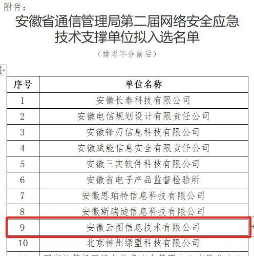 7月19日,我司成功入选安徽省通信管理局第二届网络安全应急技术支撑单位。我司凭借丰富的技术积累和实践经验,已相继入选芜湖、宿州、滁州等多地网络安全应急支撑单位。未来我司也将充分利用自身优势,不断提升网络安全应急能力,为保障网络安全做出更大的贡献。