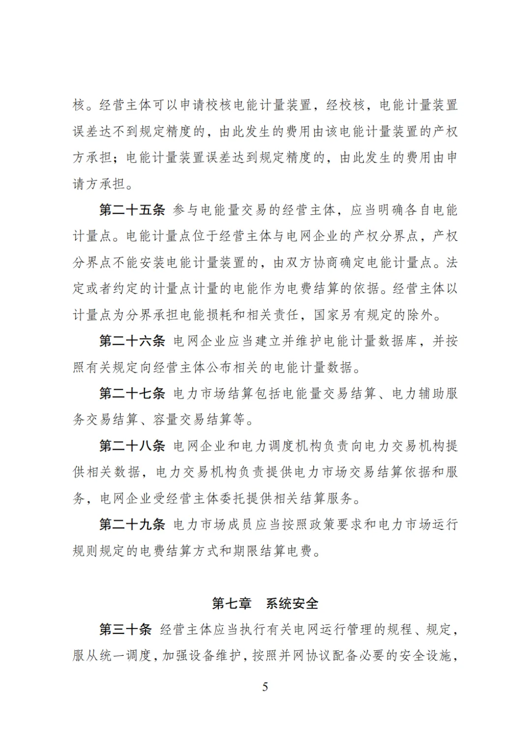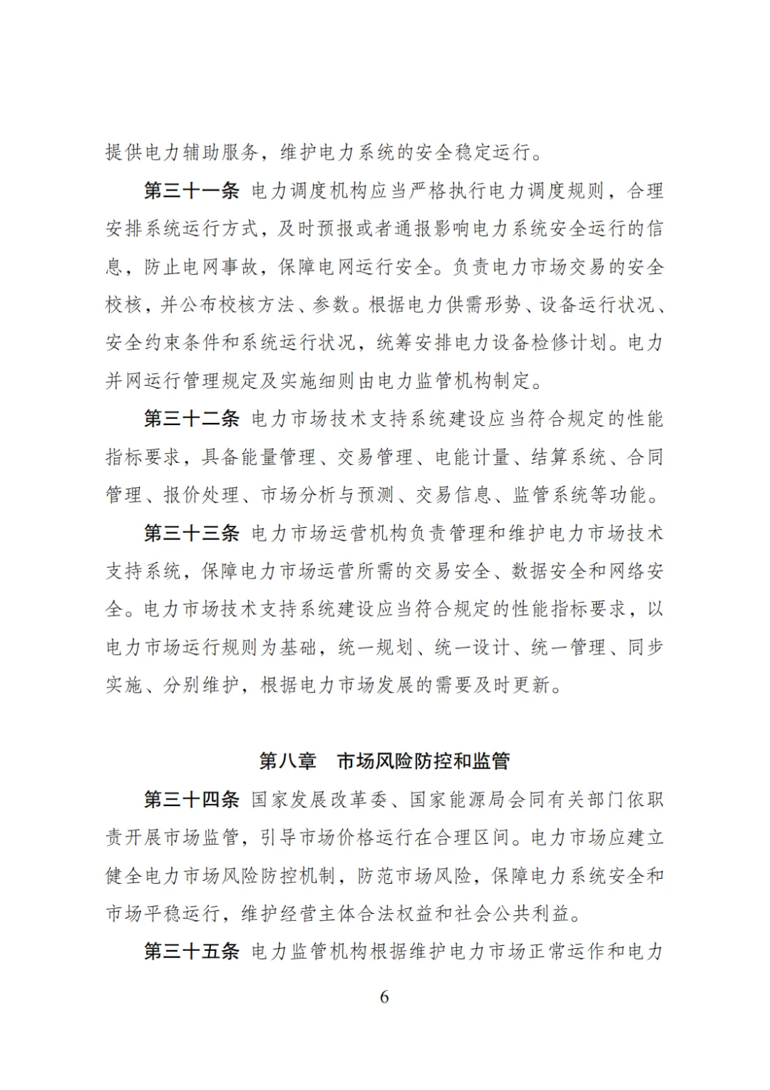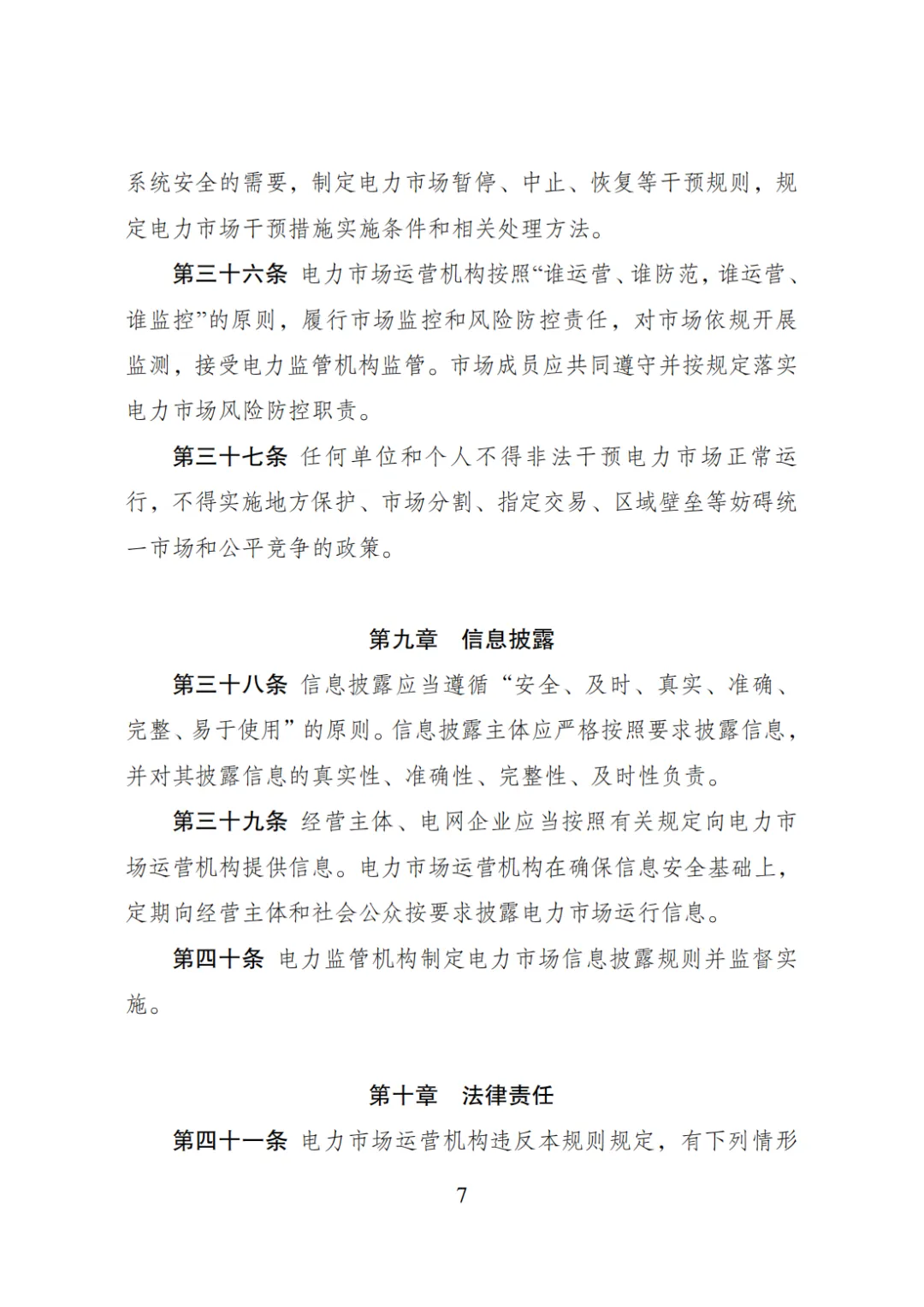 五是细化风险防控相关要求。电力监管机构根据市场运作和系统安全需要,制定电力市场暂停、中止、恢复等干预规则,规定电力市场干预措施实施条件和相关处理方法。电力市场运营机构按照“谁运营、谁防范,谁运营、谁监控”的原则,履行市场监控和风险防控责任,对市场依规开展监测。